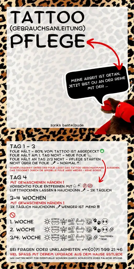 In der Bastelbude in Widnau bekommst du nach jedem Tattoo eine individuelle Pflegeanleitung, damit dein Kunstwerk genau so bleibt, wie du es dir vorgestellt hast.